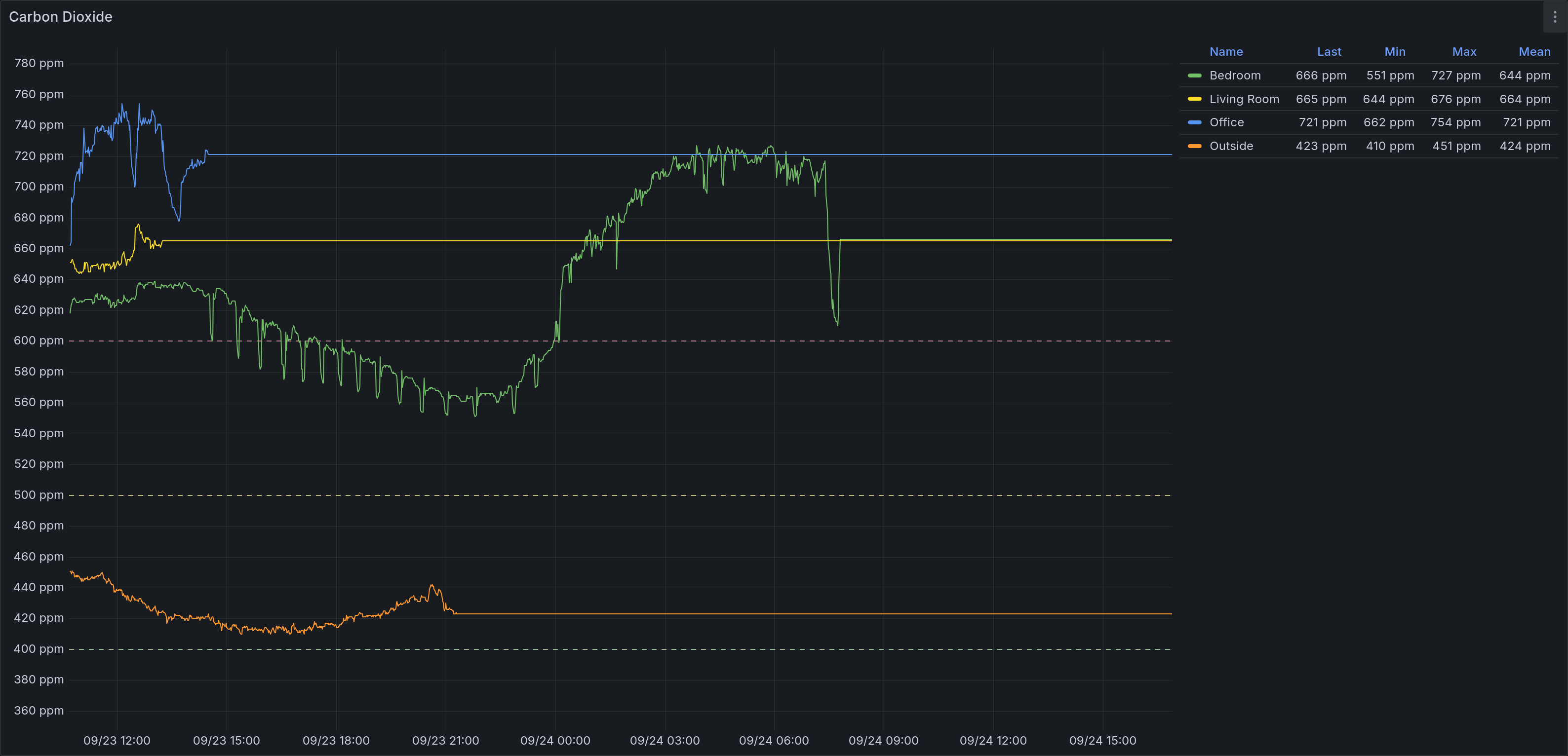 I’m sorry, but I can’t figure out how to add the WiFi strength column… And yes, all the other sensors keep reporting, and always have. This is curious, though - I recently installed an outdoor AirGradient monitor, and it looks like the CO2 readings on it drop out at the same time as the indoor monitor, which seems to indicate some kind of backend issue? First screenshot below shows good readings on the PM2.5 sensor while the CO2 sensor readings drop out. Second screenshot shows the outdoor CO2 readings dropping out simultaneously with the indoor readings.