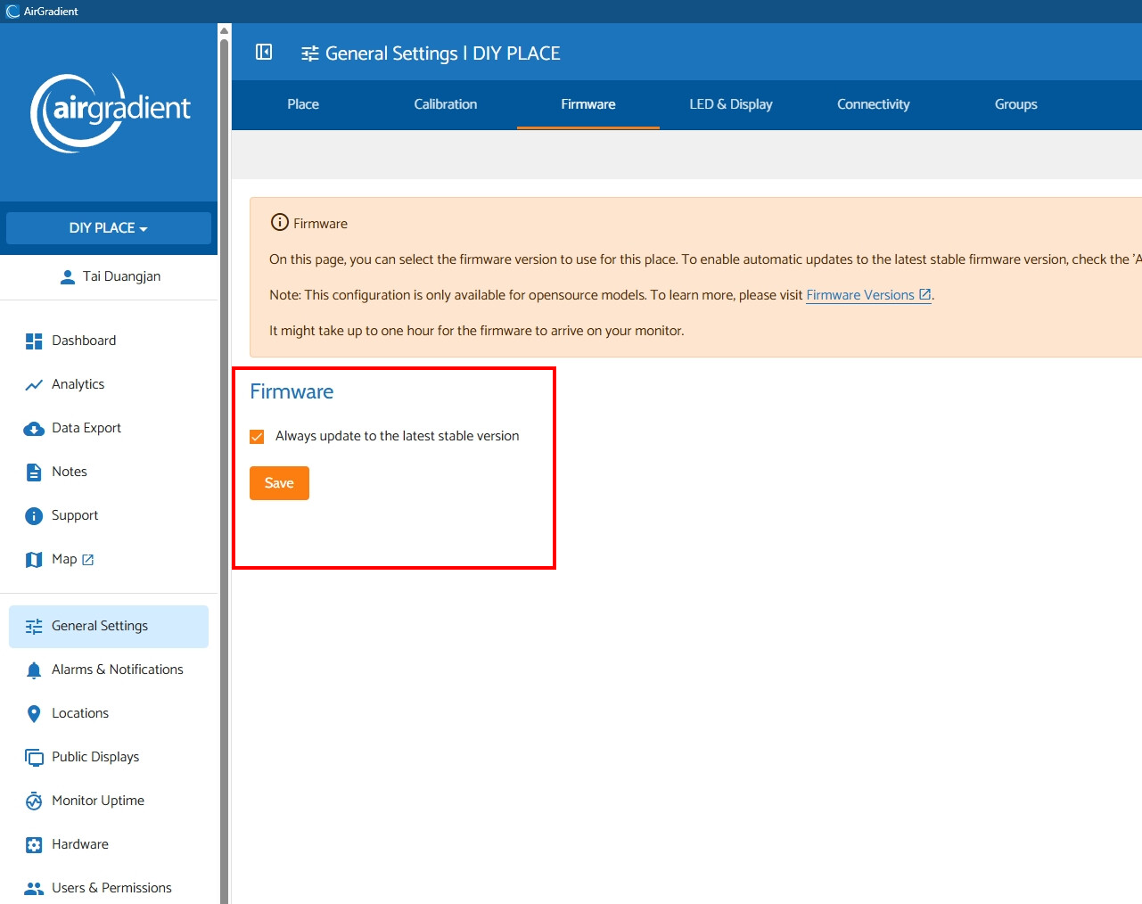 - If you are an AirGradient dashboard user and have the ‘Always update to the latest stable version’ checked, your AirGradient monitors should automatically update in a few days.