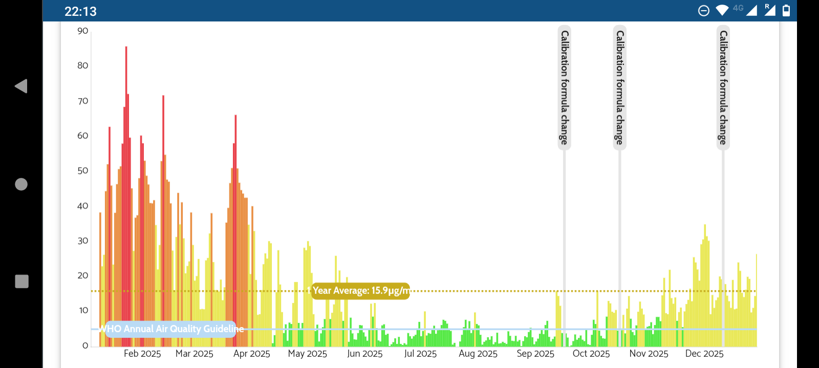 Please see attached a screenshot of my outdoor data for the last year. As you can see I applied the US EPA calibration three times (Only the first calibration change in September was an actual change, the other two I toggled back and forth between calibrated or not, so actually no significant uncalibrated data would have been saved in the interim).