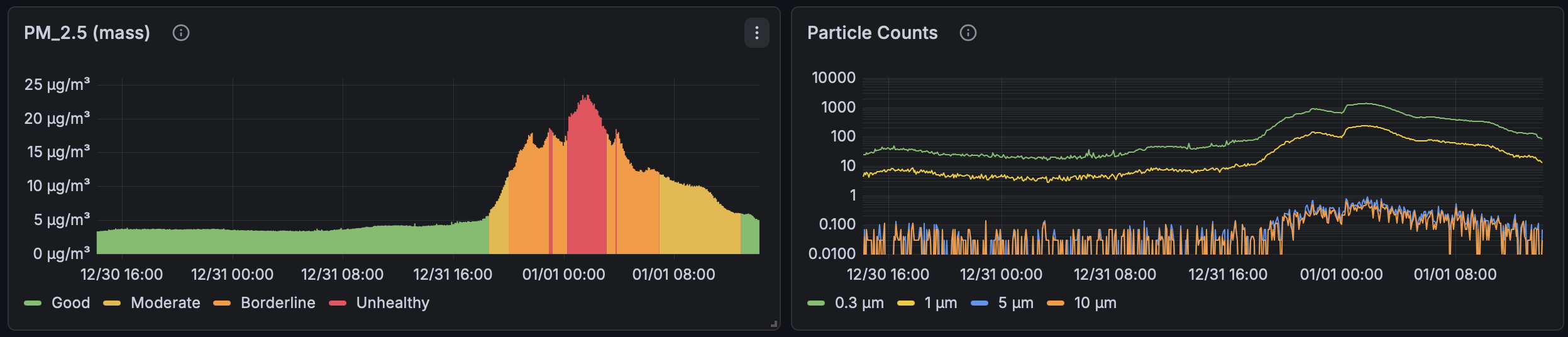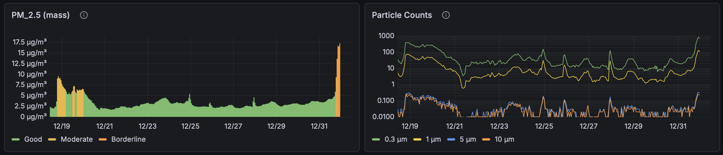 Around here (a European capital city) fireworks were cracking and booming from around 6pm until 2am or so. Not a lot were lit in our building’s immediate vicinity but they could be heard from all around. We couldn’t really smell any smoke but it really impacted the air. These readings are from an indoor sensor in our apartment. First is the last 48 hours and the second is last 14 days. You can see how signficant the impact was and how dependent the inside air is on events outside. (Though the other spikes around December 19th were I think the result of packing and shaking up bedding inside the room.) Thankfully the effect has already dissipated!