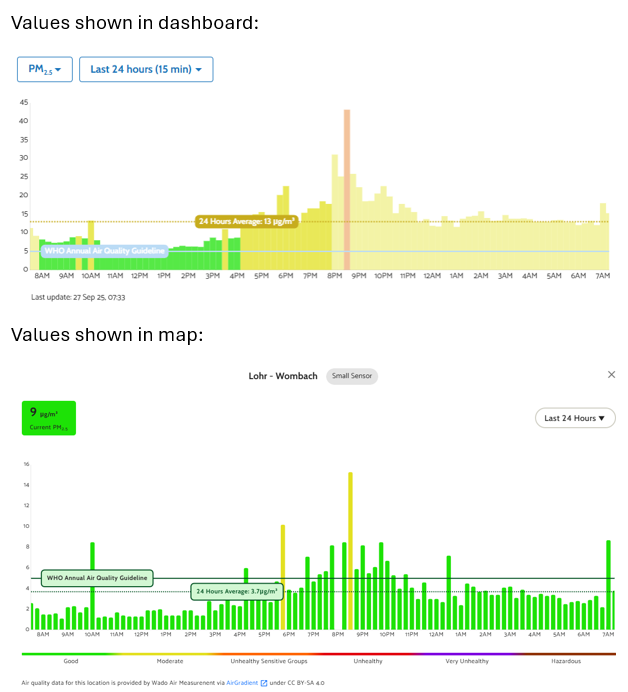 I am also observing a difference between the values shown in the map and in the dashboard. The values seem to be not even in the same ballpark and I am wondering what I can do about it. Thx for any tips on how to improve the situation.