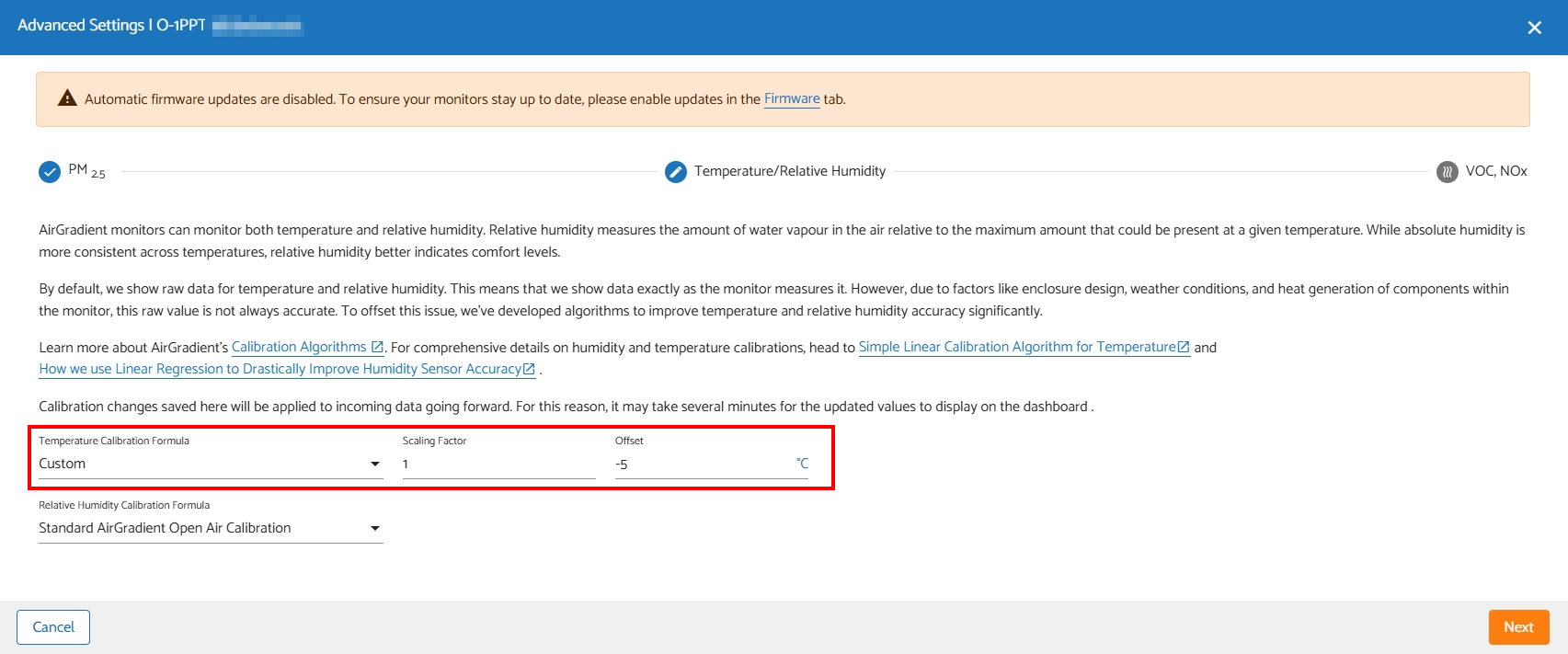 My recommendation for this is that, if you have a reliable temperature sensor for reference, and you are sure that the pattern of how it moves compared to the Open Air’s temperature reading is clear (for example, the reference temperature sensor ALWAYS reads 5 °C less than what we get from the Open Air). You might want to try a custom calibration for Temperature/Relative Humidity. This can be configured via the AirGradient Dashboard, as shown below: