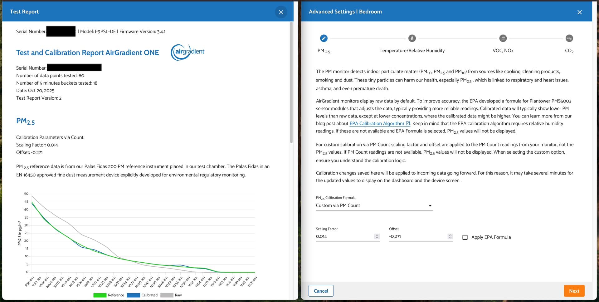 Hi, I have just received a fully assembled Airgradient One. But I am confused by the PM2.5 Calibration Formula page in the advanced settings. What should I select if I have a fully assembled unit that comes with a test report?