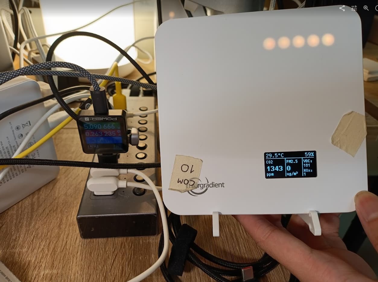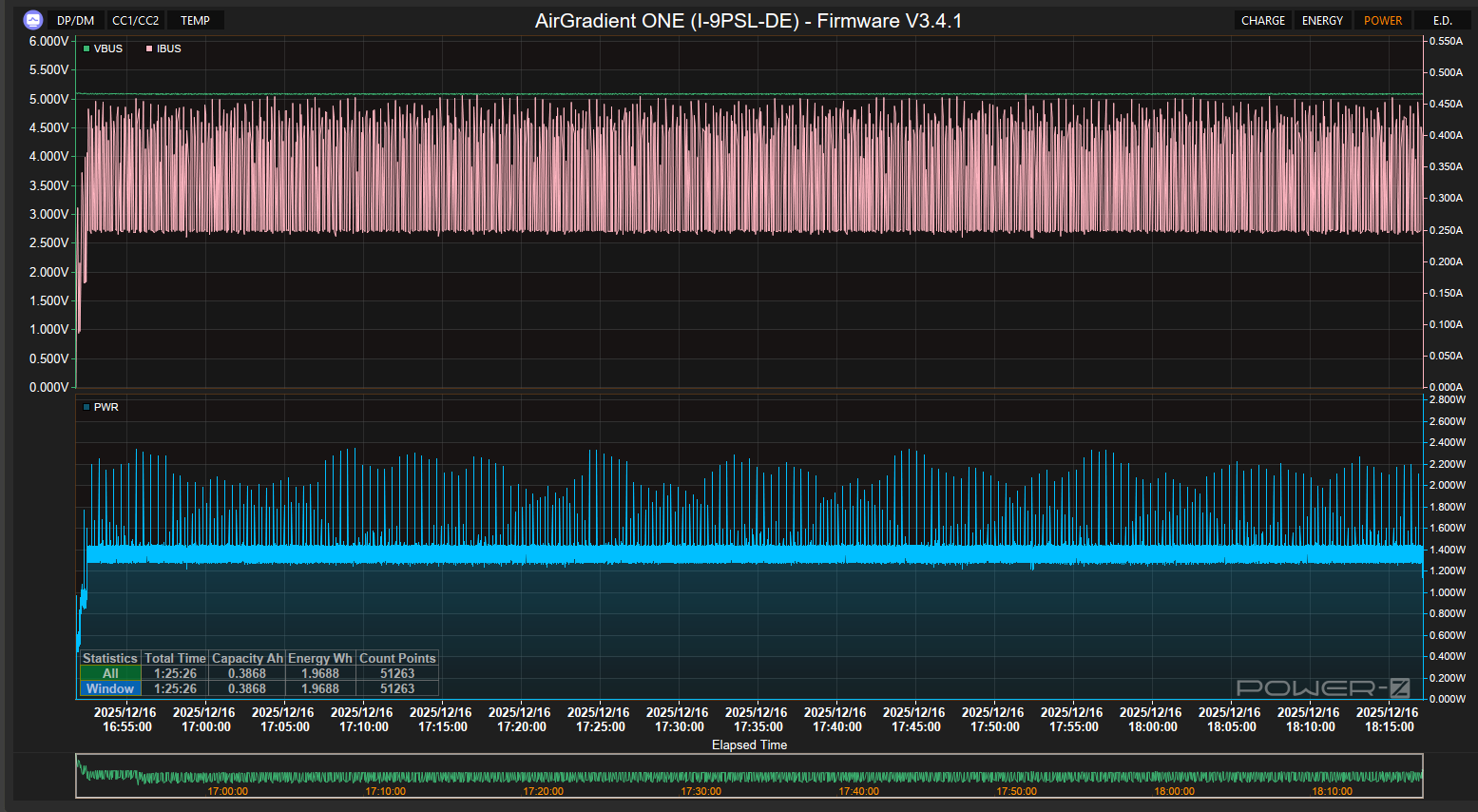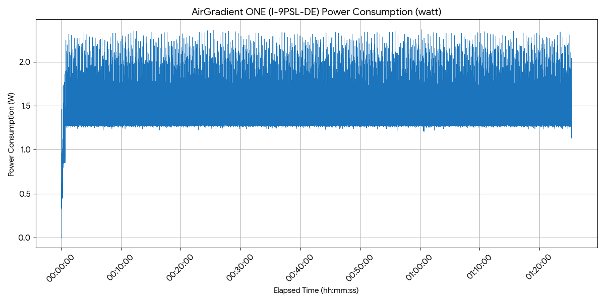 A short answer to your question, according to my test, the average power consumption of the AirGradient ONE (I-9PSL-DE) is 1.383W.